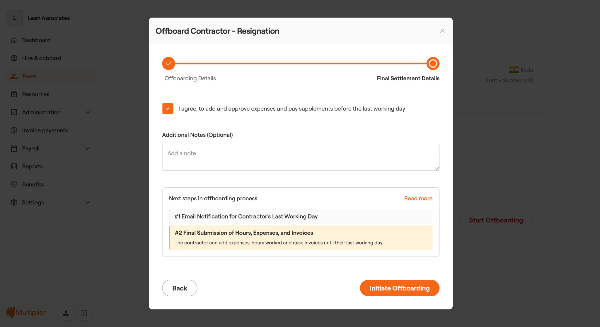 Offboarding is initiated, and the contractor will be offboarded once Multiplier verifies all the details.&#x20;