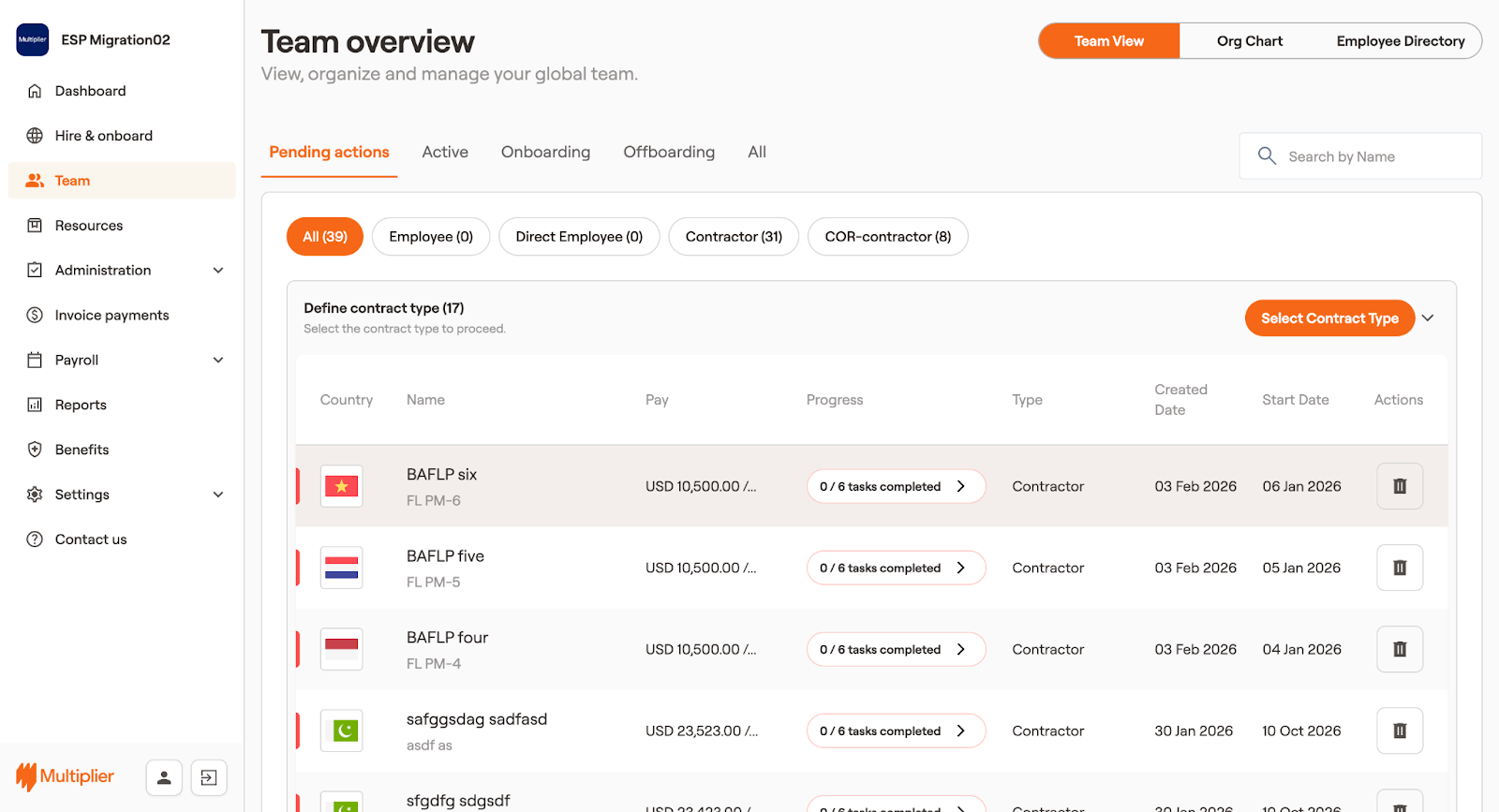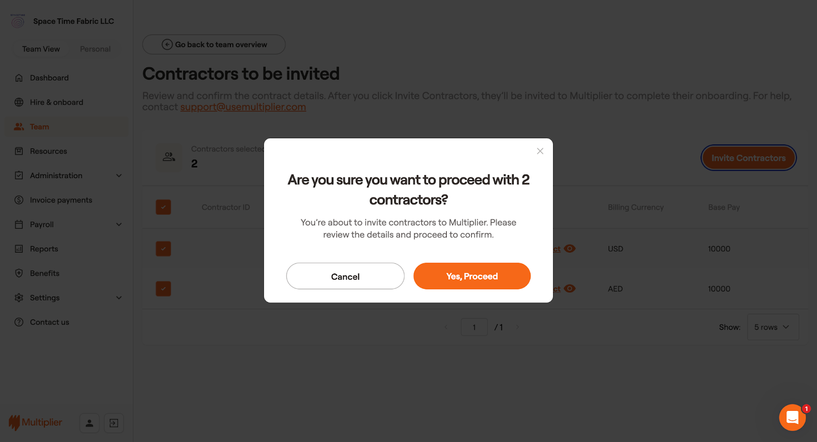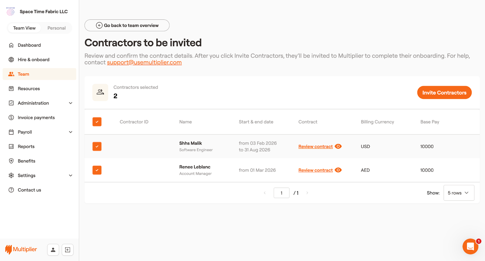 You may have paused the contractor onboarding process before sending contracts for signature or sending invitation emails to contractors to sign up on Multiplier. Multiplier allows you to resume the onboarding process exactly where you left off. Additionally, you have the option to send contracts in bulk. Learn how to resume paused onboarding or send contracts in bulk on Multiplier.