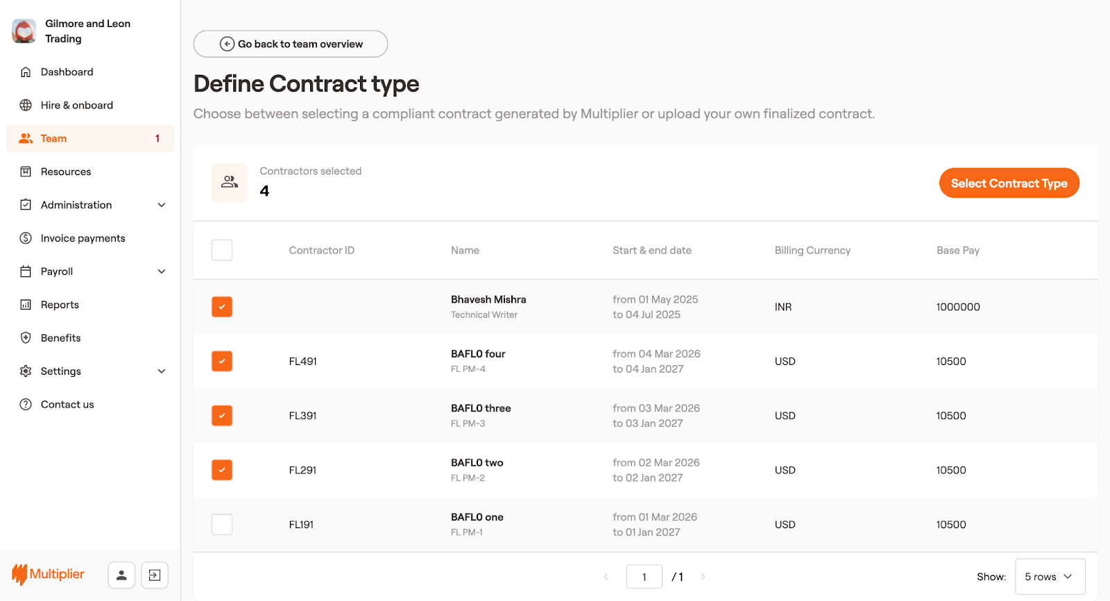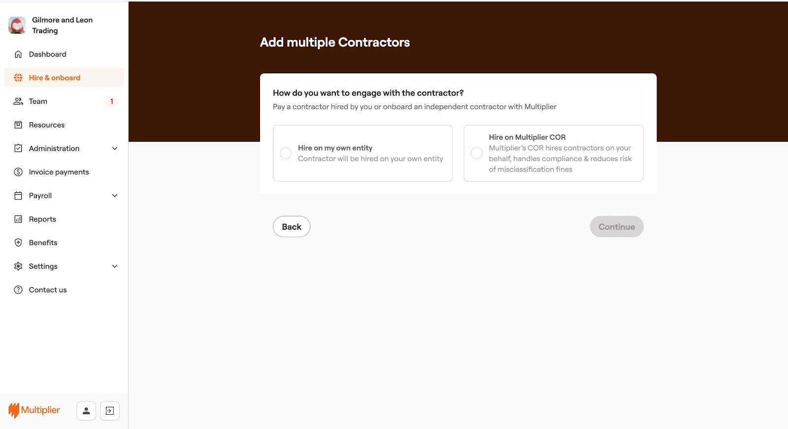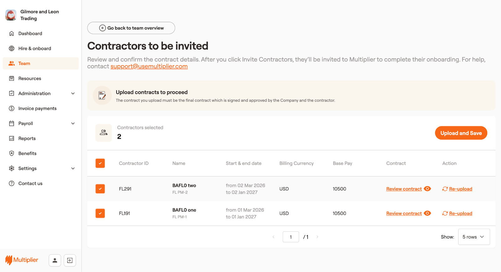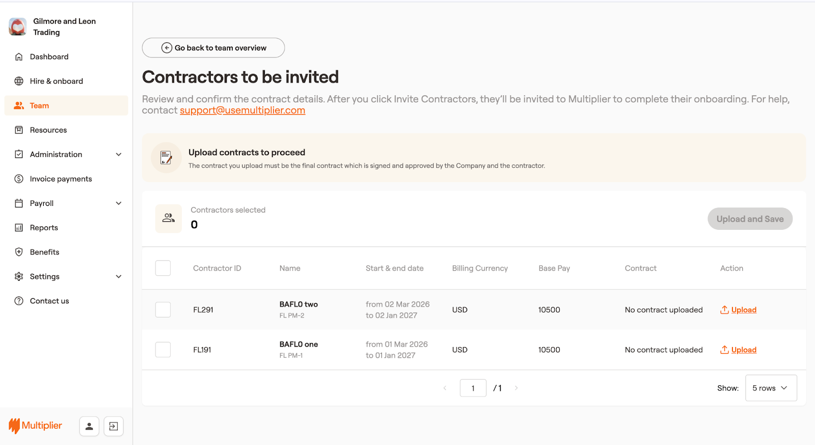 Note: If you don't want to use the Multiplier contract for all contractors, select only those for whom you do. For the rest, you can return to this section later and choose Upload your own contract.