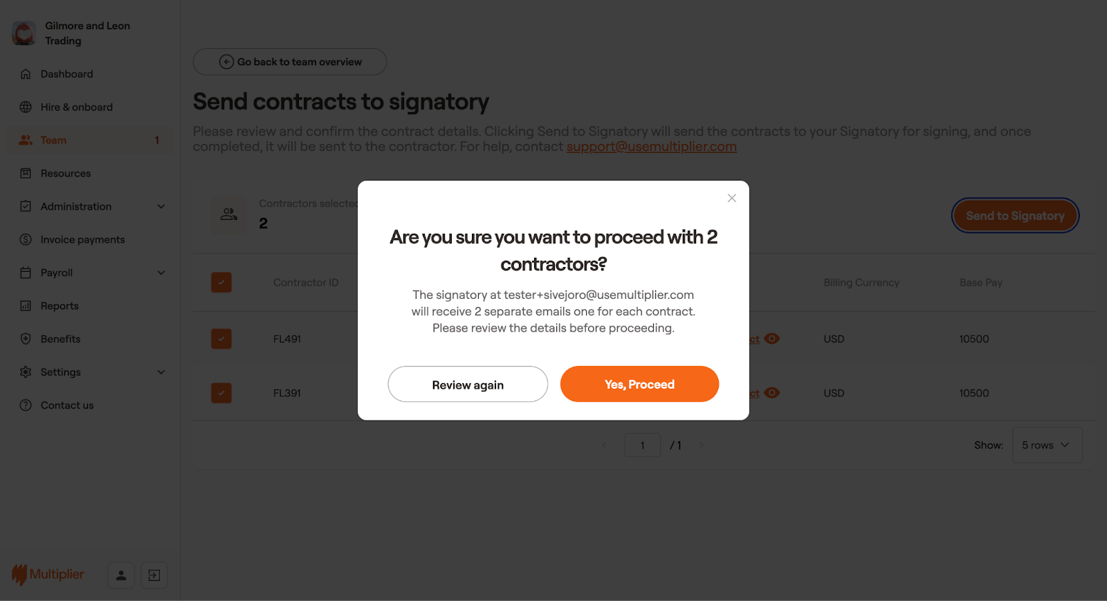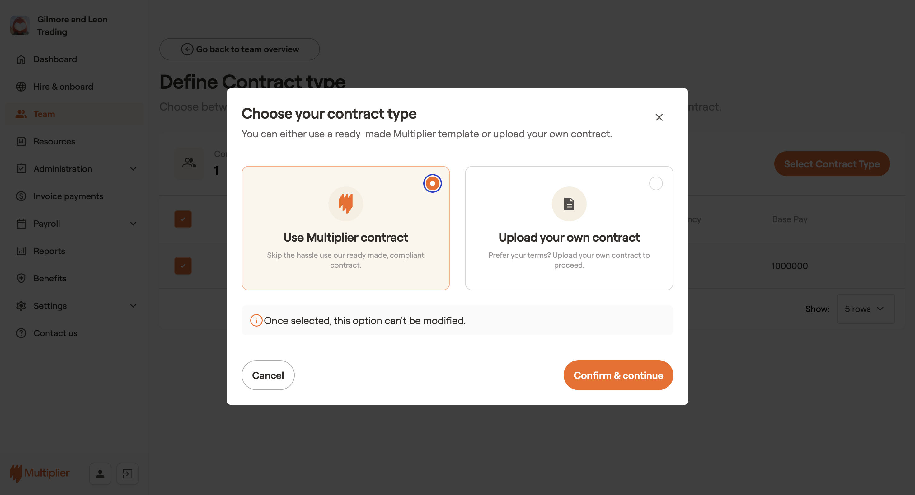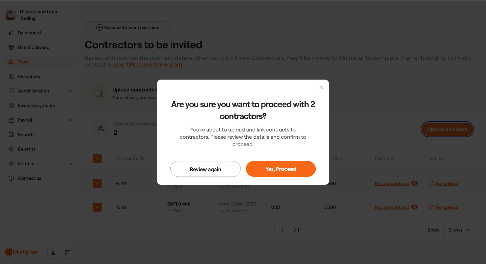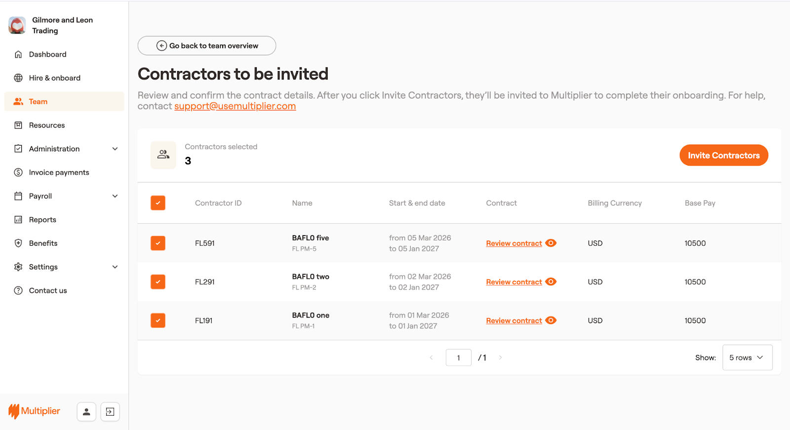 Note: If you don't want to use the Multiplier contract for all contractors, select only those for whom you do. For the rest, you can return to this section later and choose Upload your own contract.