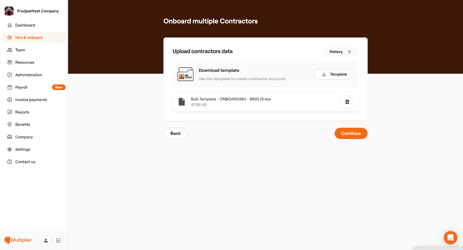 To onboard contractors in bulk, you need to download a template from Multiplier, enter the required details, and upload the filled template on the platform.&#x20;