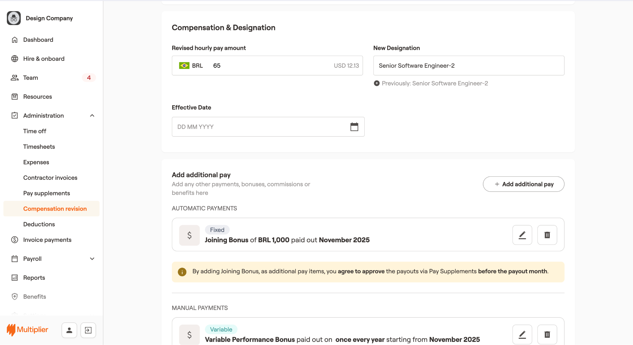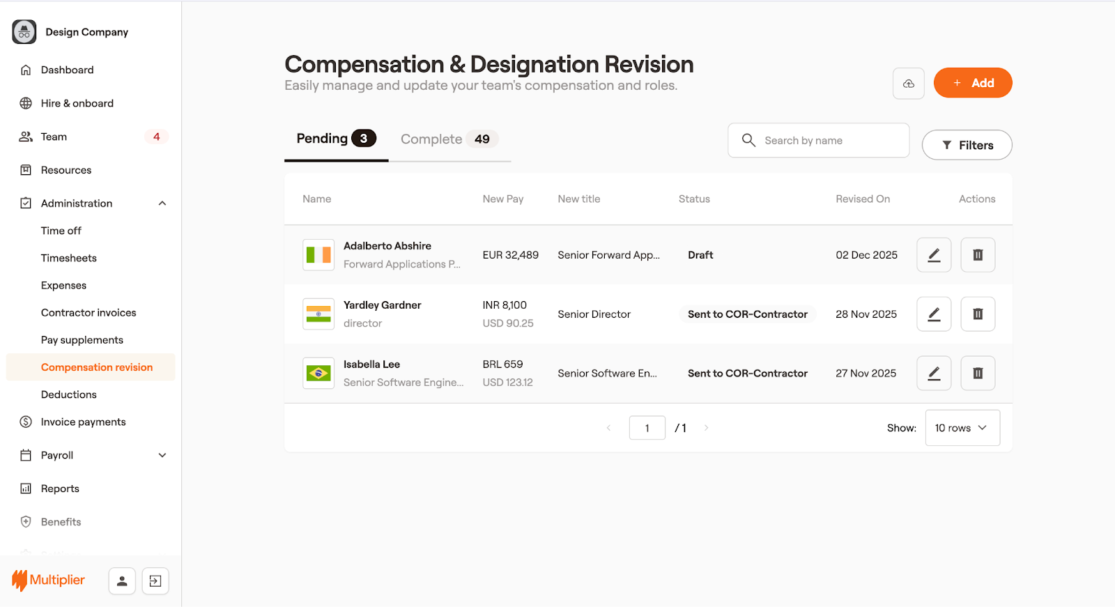 You can update compensation details, designations, additional pay components, and generate an addendum for the COR contractor directly using the Multiplier platform. Learn how to revise compensation and designation for COR Contractors:<br>